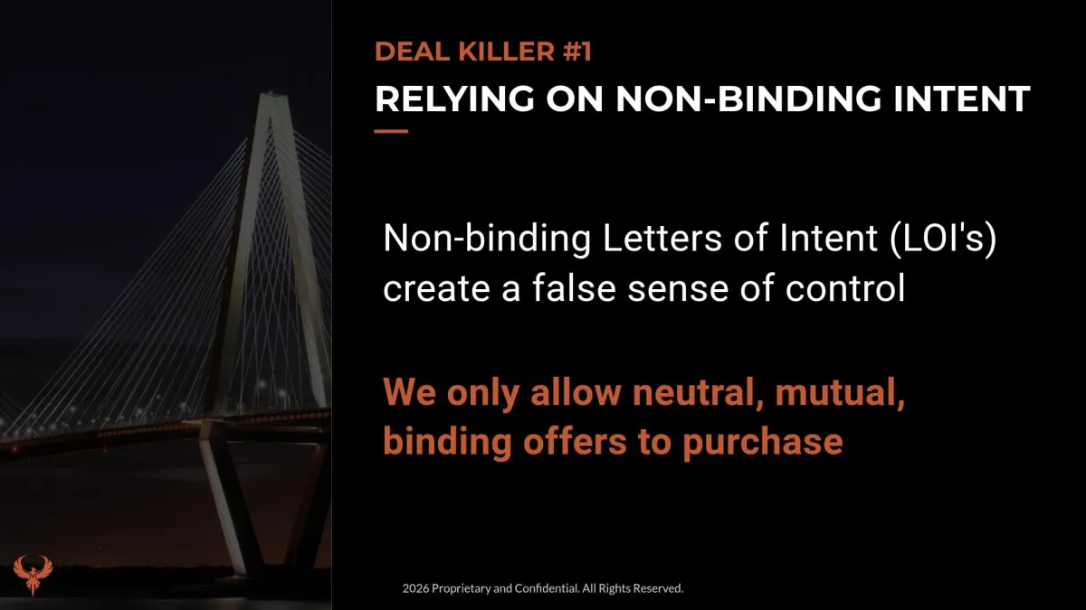 We only allow neutral, mutual, binding offers to purchase, supported by escrow, defined diligence periods, and clearly structured exit rights for you the buyer.